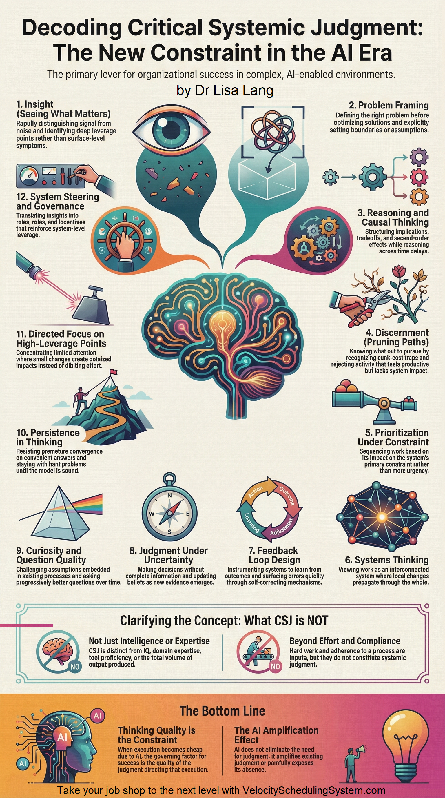 From a TOC perspective, this can be expressed as a necessary condition: For an AI-enabled organization to increase throughput, sufficient critical systemic judgment must exist to identify, frame, and exploit high-leverage opportunities. Or more compactly: AI increases potential throughput; realized throughput is often bottlenecked by critical systemic judgment. To understand this constraint, we must distinguish it from general intelligence or task execution. In low-complexity or fully specified work, execution efficiency, not critical systemic judgment, is the binding constraint. Critical systemic judgment refers to the capacity for high-quality critical thinking to frame, prioritize, and steer work across complex, feedback-driven systems under uncertainty. It is the combination of: