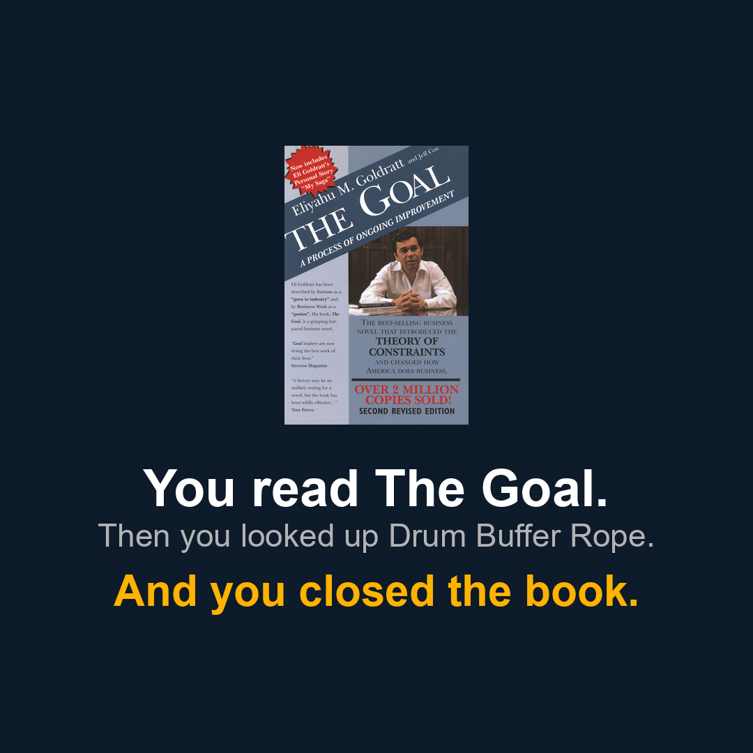 Goldratt laid it all out: the bottleneck, drum buffer rope, throughput accounting. The logic was airtight. You could see exactly why your shop was struggling, right there in a novel about a fictional plant.